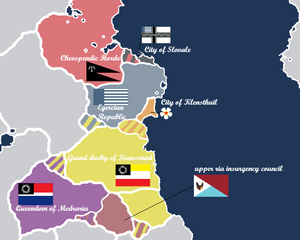 The Nuvastian administation entered a period of revolt similarly and the state collapsed, causing a crisis as the balance of power in the region shifted. The coalition decided to put a foriegn state in power to rebuild a functional government. Due to Sahrland's precarious positioning and lack of power, they were chosen as the most likely candidate to abide by neutrality. The Treaty of Phoezi declared the territory sahren, however unrest in the Wardia province proved nearly impossible to quell so the territory was allowed to break free with Sahrland gaining other minor concessions in return. Additionally the treaty port of Chadastok was purchased from Orion.